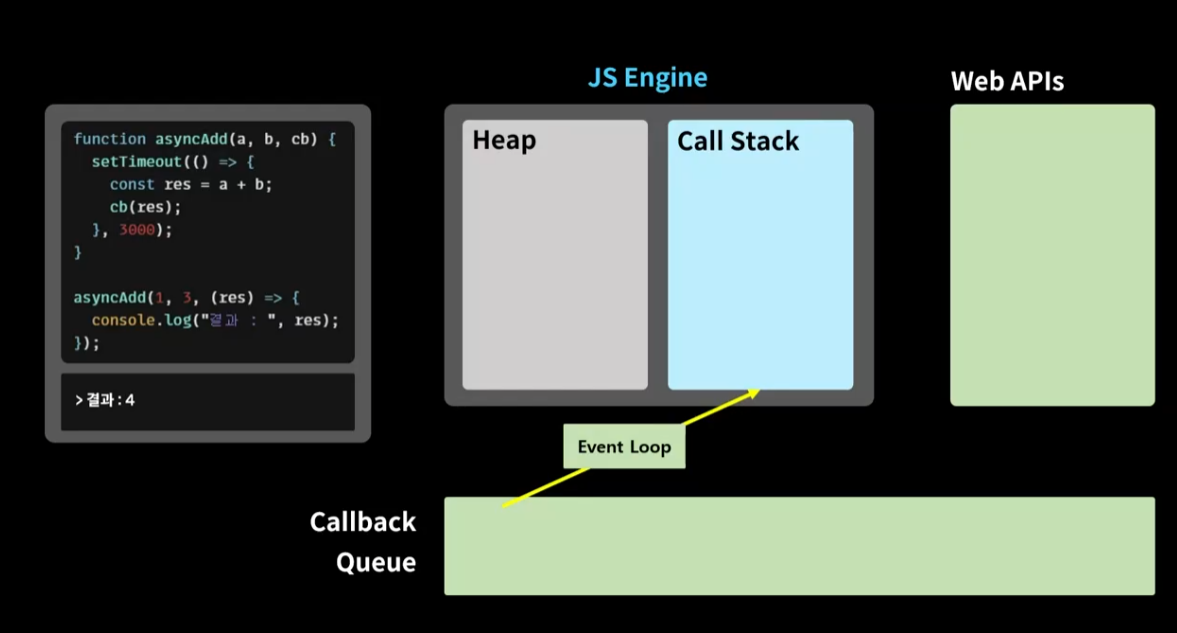 비동기적 처리 ; Web APIs에 옮겨진 후 , 비동기적 처리 됨 -> Callback Queue에 옮겨지 후 Call Stack에서 처리