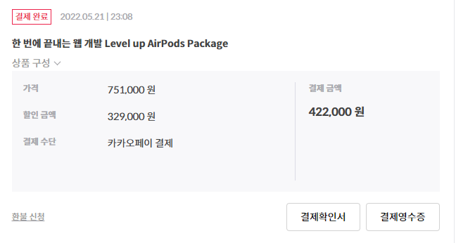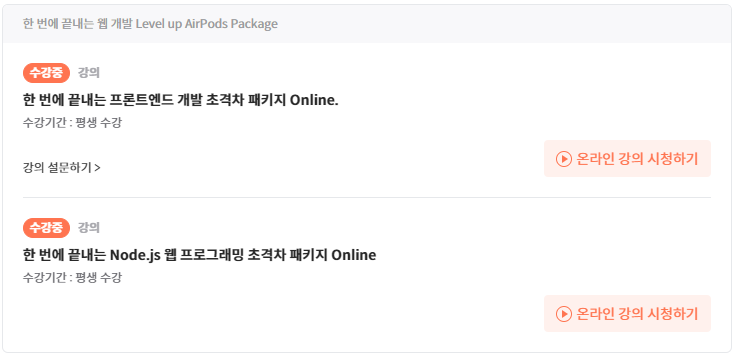 웹 프론트엔드에 흥미를 느낀 나는 강의를 수강하였다. 내가 들은 첫 강의는 패스트 캠퍼스의 "한 번에 끝내는 웹 개발 Level up AirPods Package"였다. 결제 금액은 422,000원이었고, 강의는 아래 사진처럼 "한 번에 끝내는 프론트엔드 개발 초격차 패키지 Online"과, "한 번에 끝내는 Node.js 웹 프로그래밍 초격차 패키지 Online"로 구성되어 있다.