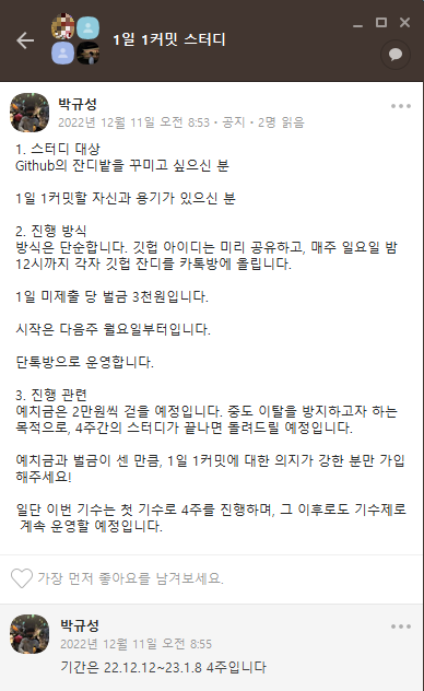 스터디가 끝나자마자 1월 9일부터 1일 1 커밋 스터디를 빠르게 모집하여 다시 진행하고자 한다.
