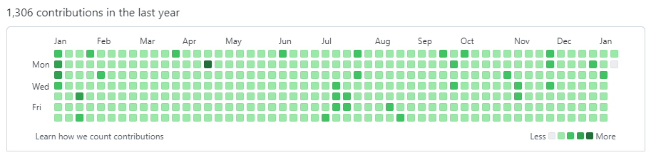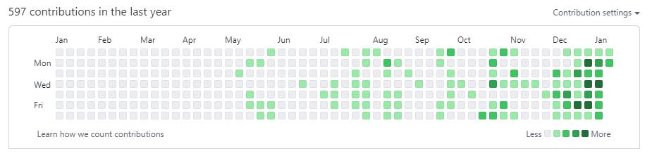그래도 나는 잔디를 채우고 싶었다. 개발자의 성실도를 볼 때, 잔디 채우기가 하나의 성실도의 척도가 될 수 있다고 생각한다. "Atties"프로젝트 팀원들을 모집하며 1순위가 다양한 팀 프로젝트 경험, 2순위가 성실도였다. 성실도의 기준으로 Github에 얼마나 빈번하게 커밋을 했느냐도 고려했다. 다른 모든 조건이 똑같은 지원자가 두 명 있을 때, 잔디가 뜨문뜨문 한 사람 보다, 빽빽한 사람이 더 성실할 것이라고 유추할 수 있기 때문이다.