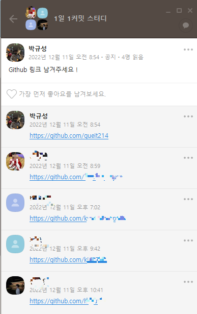 스터디를 좋아하는 나는 같은 목적을 가진, '1일 1 커밋'스터디를 1달간 운영해 보기로 결정했다. 우선 스터디원이 너무 많으면 운영이 힘들 것을 고려해, 선착순으로 5명만 뽑았다.