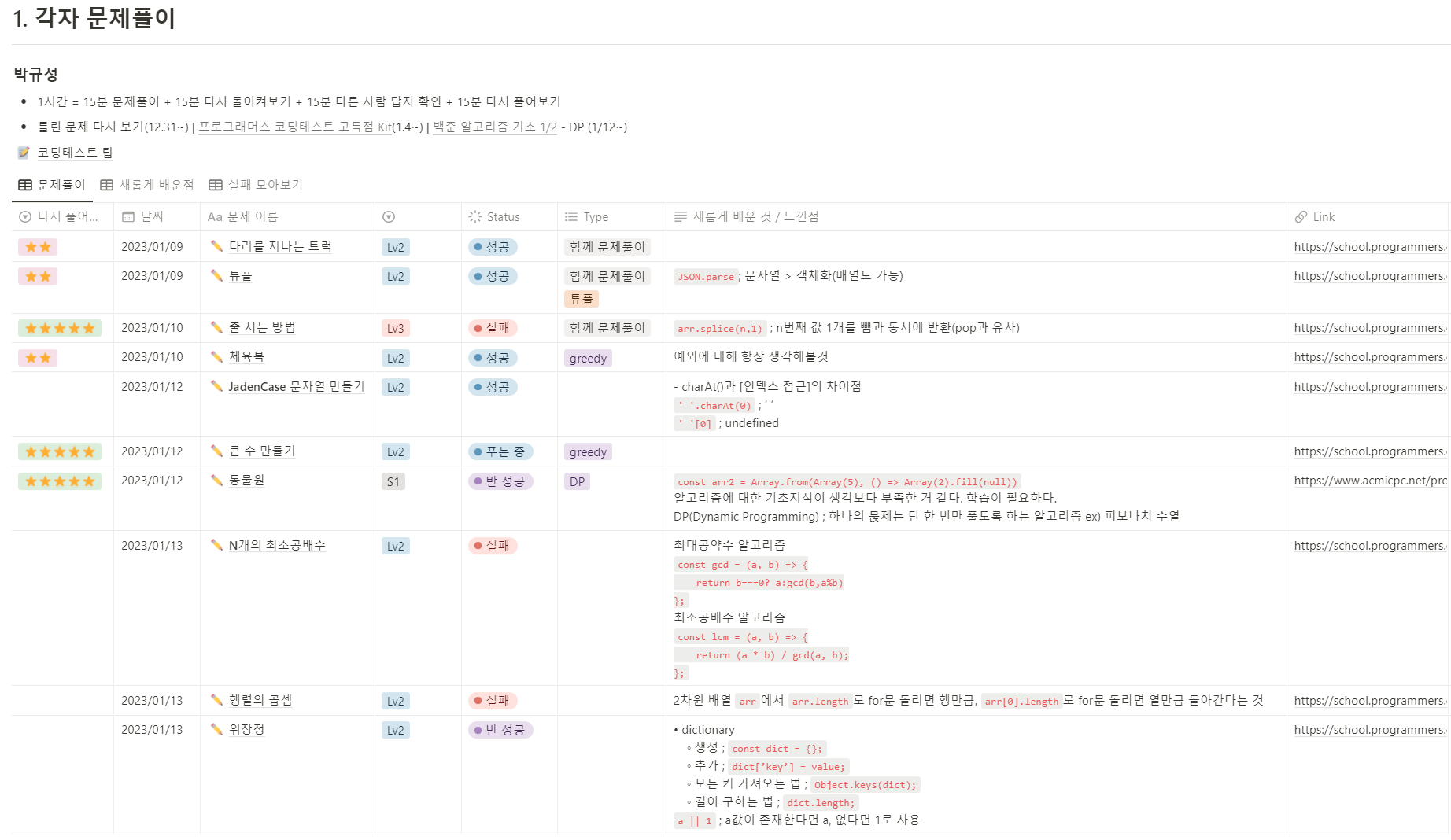각자 문제 풀이는 말 그대로 각자 문제를 푸는 것이다. 하루에 문제 수는 두 문제가 적당하다고 생각하여, 1주일에 2x5=10문제 이상 풀면 된다. 기록은 노션으로 통일하였고, 아래처럼 모든 사람의 풀이를 다 같이 공유하였다. 도서관에서 다른 사람이 열심히 하는 모습을 보며 더 열심히 하게 되는 동조 효과를 느끼고 싶었다. 나 또한 스터디장으로써 모범을 보이기 위해 더욱 열심히 풀었다.