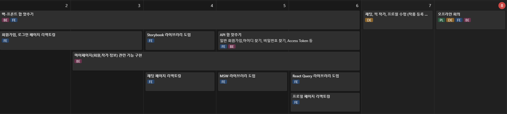 백엔드 파트가 지난 주말에 열심히 작업하여 서버가 구축이 되었다. 그에 따라 이번주부터 본격적으로 프론트엔드 파트에서도 API테스트와 API구현을 진행하였다. 작업이 기획> 디자인> 프런트엔드>>백엔드 순으로 완료된 상태였다. 백엔드 파트가 프로젝트 초반에 부득이한 사유(외부 기관 합격)로 인해 이탈자 2명이 발생하여 새로운 멤버를 영입하고 적응하느라 시간이 조금 지체되었다. 백엔드 파트만 2주차인 지난주부터 본격적으로 시작했다고 해도 과언이 아니다. 주말에도, 저녁 이후에도 PR이 계속 올라오며 열심히 작업한 덕분에 작업 속도를 다른 파트를 많이 따라왔다.