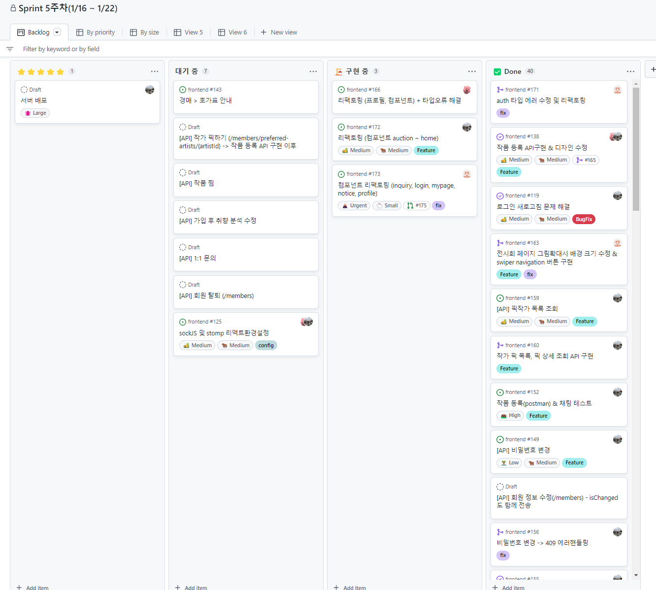 기존에는 노션에 작성하였는데, Github의 Project로 칸반 보드를 옮기었다. Github의 Issue와 연결시킬 수 있다는 점 외에는 아직까지는 큰 장점을 모르겠다. 노션에서는 우리끼리만 공유했다면, Github으로 옮기게 되면서 우리의 프로젝트 작업 현황을 모두가 볼 수 있게 되었다는 이점밖에 아직은 느끼지 못하겠다.