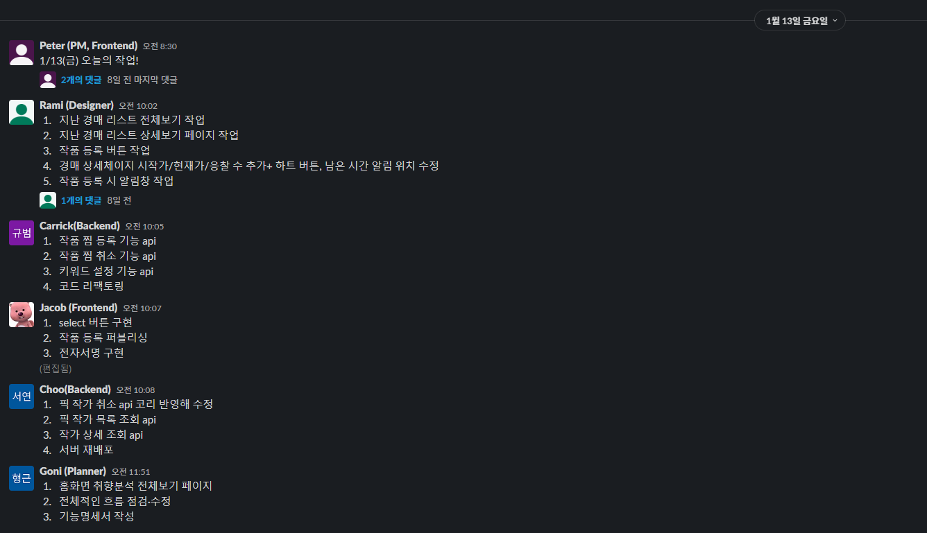 1. Peter(나) ; 경매 페이지, 작가 프로필 전환 API, 서버 배포 | 2. Jacob ; 채팅, 작품 등록 | 3. Max ; 전시회, 홈 페이지