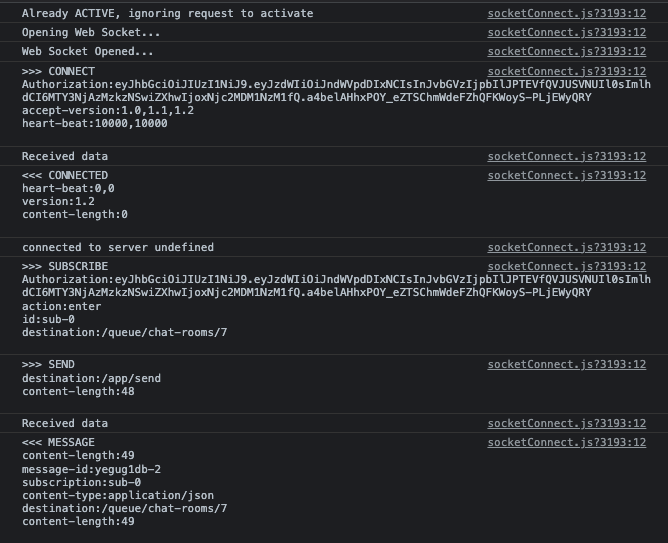 위에서 구현한 웹소켓의 debug를 console에 찍어본 화면입니다. 제가 채팅방에 접속하여, 채팅을 전송한 debug입니다. >>>은 제가 서버 측에 보낸 정보, <<<는 서버 측에서 저희에 온 정보입니다.