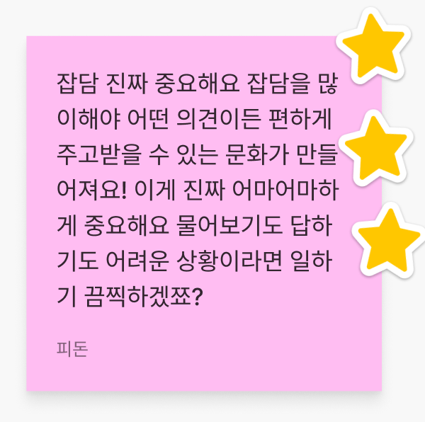 3. 잡담 습관화하기. "잡담이 있어야 어떤 의견도 편하게 주고받을 수 있는 문화가 형성된다"
