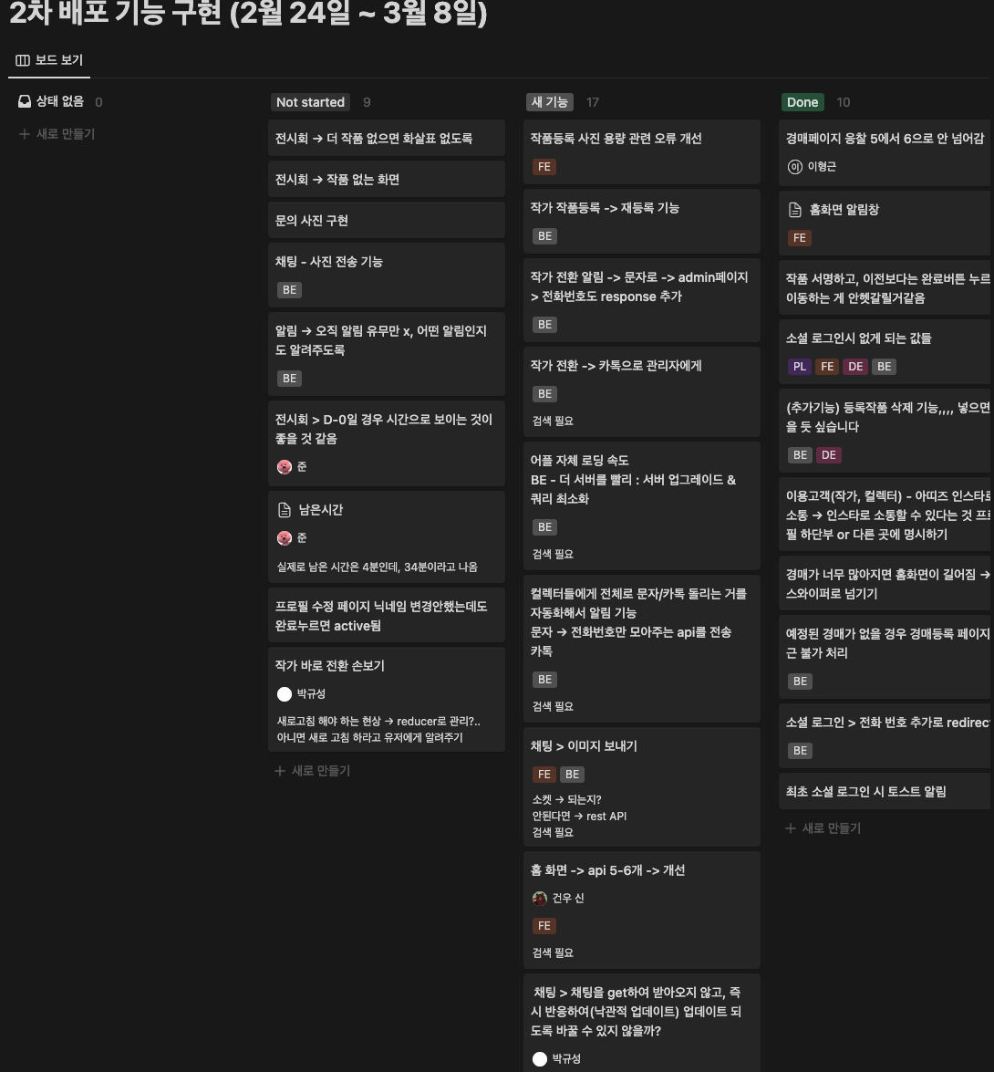 그리고 앞으로 구현할 추가 기능들을 다 같이 작성해 보았다. 지난 8주처럼 타이트하게 할 수는 없지만, 차차 기능 하나하나씩 구현해 나가다 보면 오류도 없고, 속도도 개선된 완성된 서비스에 다가갈 수 있지 않을까?
