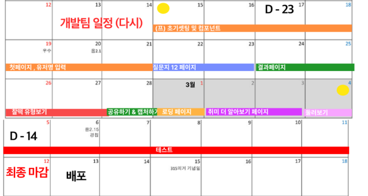 기존 일정보다 모두 1주 앞당겨졌다. 기존 일정은 테스트가 없었어서, 이렇게 진행하는 게 맞는 거 같다. 사실, 페이지가 그렇게 많지 않아서 하루 이틀만 타이트하게 수행하면 충분히 가능한 부분이다. 금, 일요일에 힘들게 진행해 보자!