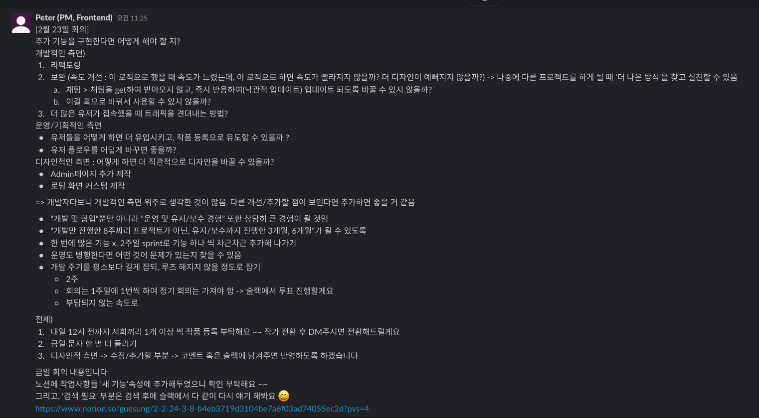 금일 회의 내용이다. "8주짜리 프로젝트에서 끝나면, 그저 8주 짜리 사이드 프로젝트에서 끝나게 된다. 그러나, 그 이상을 계속 운영 및 유지/보수한다면 그 이상 규모의 프로젝트가 될 수 있다"는 취지로 오늘 회의를 열어 보았다. 정해진 프로젝트 기간(8주)이 지났음에도 모든 사정이 생긴 한 분 제외한 여섯 명의 팀원이 모두 모여주었다.