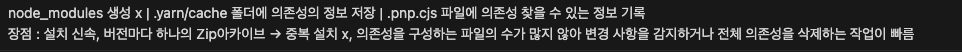 어제 팀원과 이야기하다가 팀원이 'yarn cache가 뭐예요?' 물었는데 대답을 못하였다. 내가 사용하고 있는 환경인 yarn berry의 기초지식인데도 대답을 못한 것에 내가 아직 많이 부족함을 느꼈다.