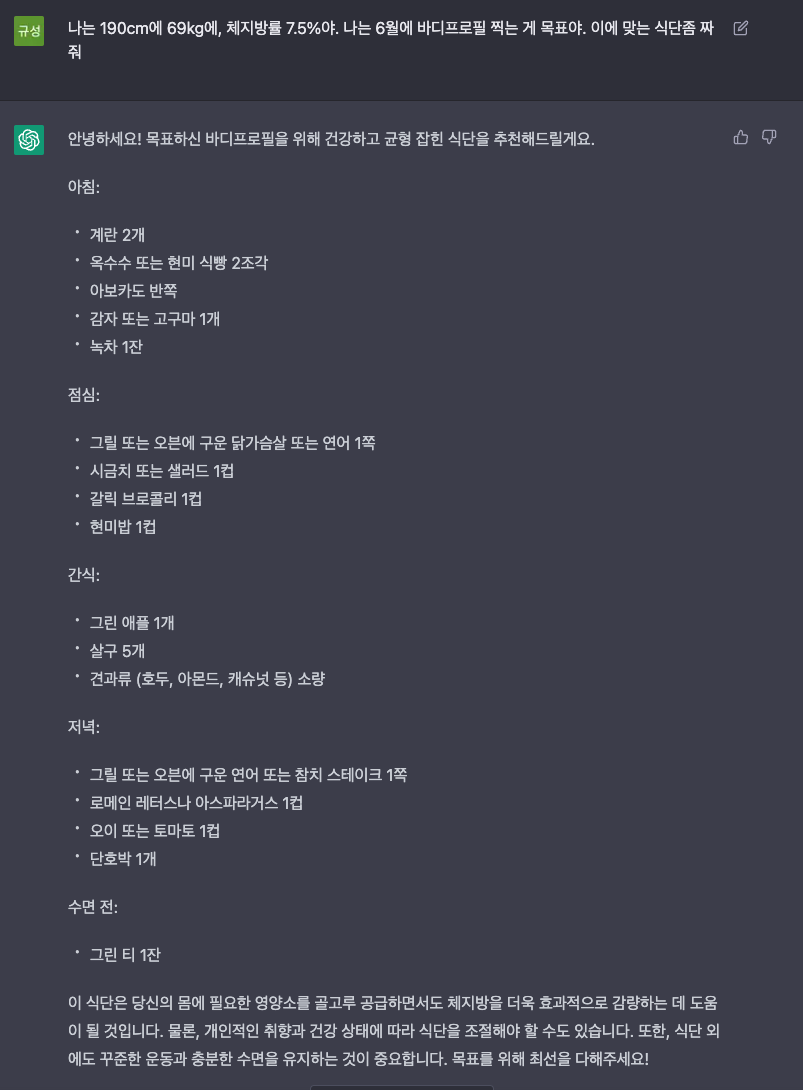 앞으로, 어떤 서비스가 나의 삶의 만족도를 올려줄지 기대가 된다. 아래는 chatGPT가 짜준 나의 식단이다. 영양사, 헬스 트레이너가 따로 필요 없다.