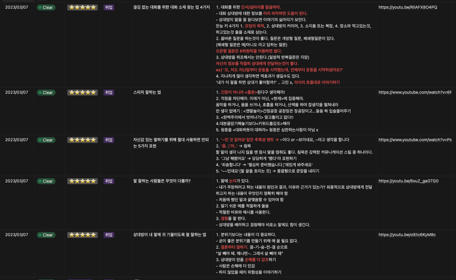 다른 좋은 팁들도 많았지만, 너무 많이 적어봤자 모두 실천하는 것은 불가능하기에 일단 머릿속에 꼭 입력하고 싶은 것들만 적어보았다. 이 메모들을 자주 봐야겠다. 아니, 노션 '즐겨찾기'에 추가해야겠다. 유튜브라는 무한하게 확장되는 플랫폼을 통해 돈 주고도 듣기 힘든 명사들의 명강의를 들을 수 있음에 너무나 큰 감사를 느낀다. 앞으로 이런 유튜브의 유익한 점을 적극적으로 활용해야겠다.