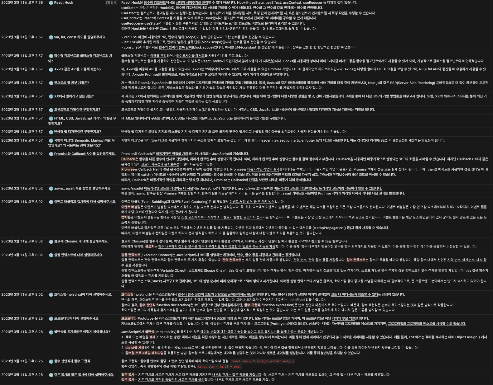- 면접 준비는 면접에서만 도움이 되는 것이 아니라 프런트엔드 개발에 대한 기초 공부, 말하기 연습, 나를 돌아볼 수 있는 다방면으로 도움이 될 것이다. 그러니, 일단 무작정 연습하자.