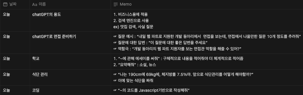 위의 내용은 오늘 강의에서 정리한 내용이다. 내가 생각했던 것보다 chatGPT를 다양하게 이용할 수 있었다. chatGPT의 사용성은 참 무궁무진한 것 같다. chatGPT가 발표된 지 그리 오래되지 않아서 그렇지, 시간이 조금 더 지나서 기능이 추가되고 제도가 바뀐다면 사라질 직업들이 상당히 많을 것이라 생각된다. 특히 사무직.. 이 가장 먼저 사라지지 않을까. 벌써 이런 세상이 도래했다는 것이 믿기지가 않는다. 나 또한 이에 대한 대책이 필요하다. AI라는 거인의 어깨에 올라타야 한다.