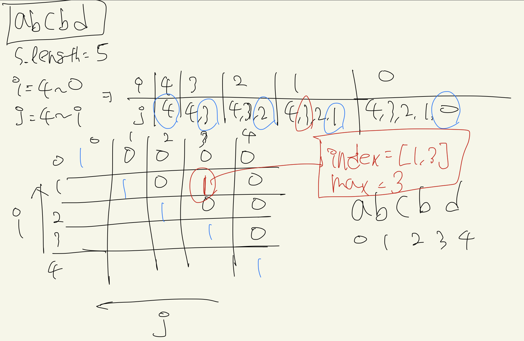 - i=1,j=3(bcb)처럼 대칭인 문자열일 경우 dp[i][j]=1로 바꿔주고, 결과값이 될 index와 max를 바꿔준다.