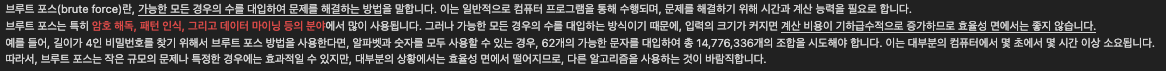 위의 첫 번째 풀이처럼 모든 경우의 수를 대입하여 문제를 해결하는 방식이다. 말그대로 "무식하게 다 해보는" 방식이다. 입력의계산 비용이 기하급수적으로 증가하므로 효율성 면에서는 좋지 않기에, 다른 방식 있다면 다른 방식을 권한다. 보통은 암호 해독, 패턴 인식, 데이터 마이닝 등 모든 경우의 수를 따져봐야 하는 경우 사용한다.