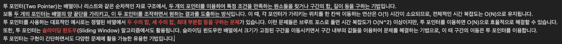 두 번째 풀이에서 사용한 방식으로, 두 개의 포인터를 이용해 특정 조건을 만족하는 원소를 찾는 기법이다. l과 r 두 개의 포인터를 이용해, 조건을 만족하면 l--, r++하여 연산을 이어나가는 방식으로 구현했다. 두 수의 합, 세 수의 합, 최대 부분합을 구하는 문제 등이 있다.