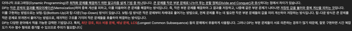 큰 부분을 작은 부분으로 쪼개며 푸는 탑 다운 방식과, 작은 부분부터 차례대로 풀어가는 바텀 업 방식이 있다. 최단 경로, 최소 비용 문제, 배낭 문제, LCS(Longest Common Subsequence)등의 문제에서 사용된다.