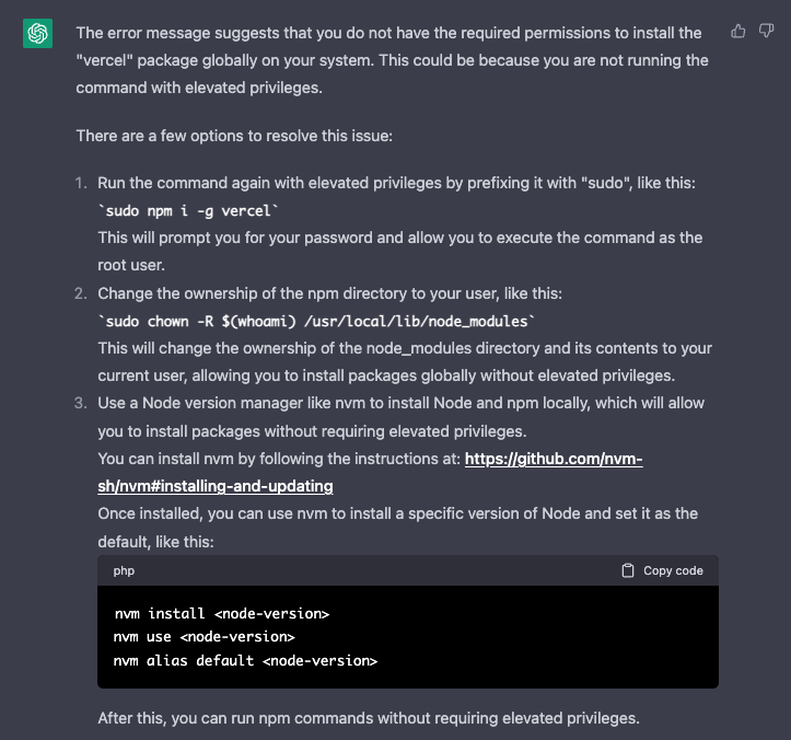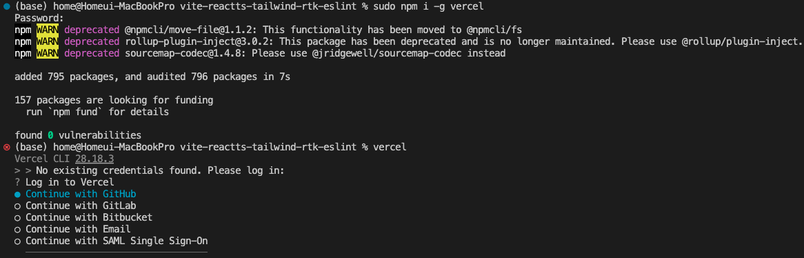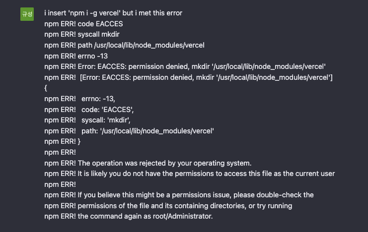 global로 설치를 하려니 권한이 없어서 발생한 에러라고 한다. 에러 원인과 함께 $sudo npm i -g vercel을 입력해보라고 조언해주었다.