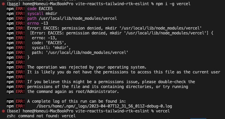 global로 설치를 하려니 권한이 없어서 발생한 에러라고 한다. 에러 원인과 함께 $sudo npm i -g vercel을 입력해보라고 조언해주었다.