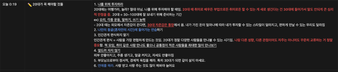 글쓴이가 말한 것처럼 20대 때 배운 취미, 새로 할 수 있는 게 생기면 30대에 들어가서 큰 심리적 안정을 준다고 한다. 내가 지금 하는 취미는 무엇이 있을까, 그리고 할 수 있는 건 어떤 게 있을까. 그리고 앞으로 하고 싶고, 배우고 싶은 건 어떤 게 있을까. 한 번 시간을 가지고 곰곰이 생각해 봐야겠다.