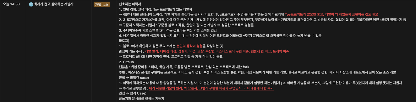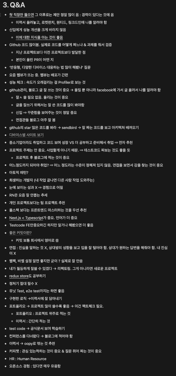4. 신입 개발자의 경우, "성실도, 꾸준함, 성장 가능성"이 매우 중요. 블로그, Github 관리하는 것이 매우 중요함. => 블로그에 주 1번씩은 꼭 기술 내용 올리기 (지난 프로젝트/새로 배운 내용들 바탕으로)