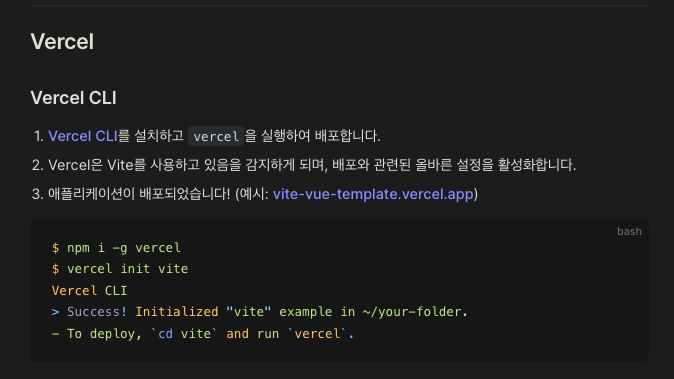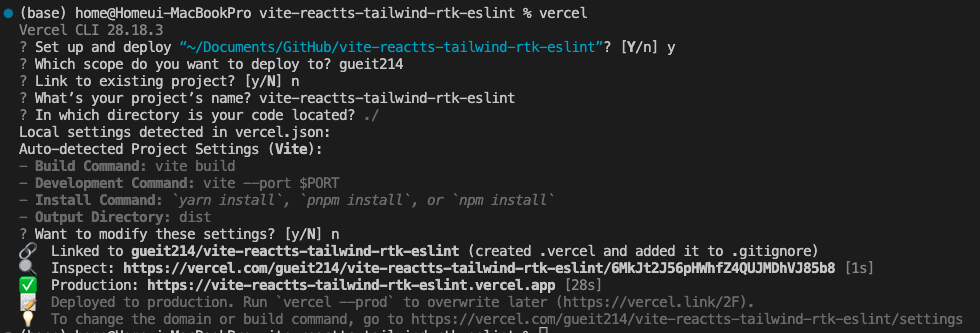 Github pages, Nelify, Vercel, Cloudflare Pages, Google Firebase, Surge, Azure 등 다양한 배포할 수 있는 클라우드가 많았지만, 나는 그중 가장 익숙한 Vercel을 택하였다. vercel 사이트에서 github에 연결하여 마우스로 클릭 몇 번만 하면 정말 쉽고 간편하게 배포할 수 있다. 이번에는 Terminal에서 CLI로 local환경에서 해보았다.