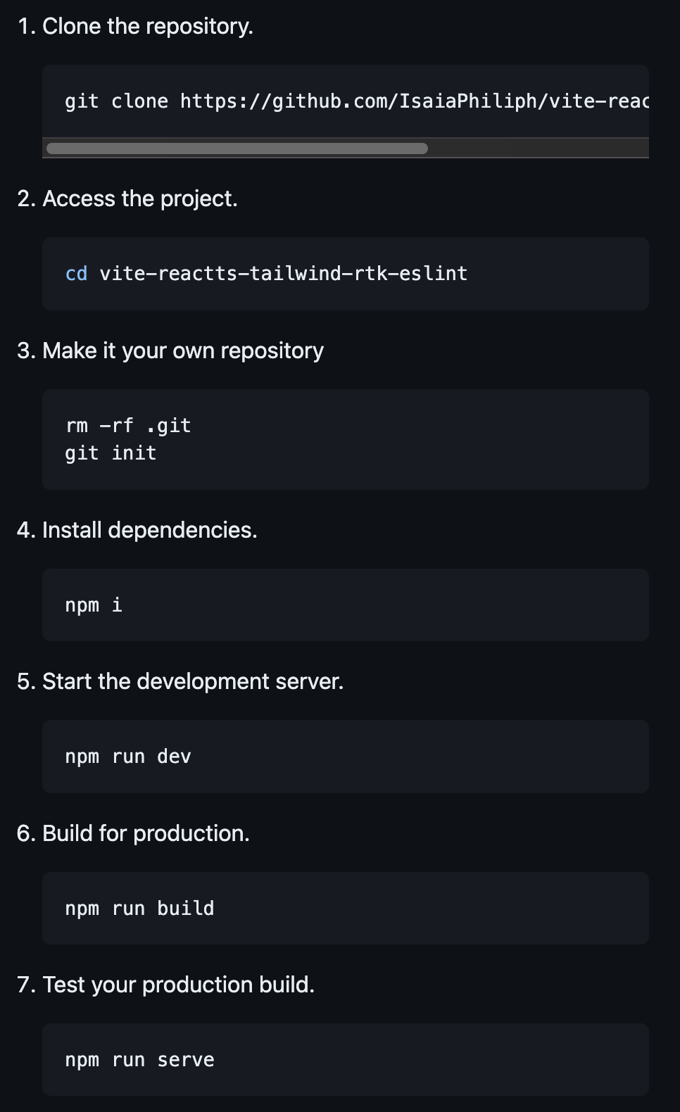 나는 내가 가장 익숙한 'React, Typescript, Tailwindcss, Redux Toolkit, eslint with Vite'템플릿을 다운로드하였다. 방법은, Vite 공식 문서에서 알려주는 awesom-vite에서 원하는 툴로 구성된 템플릿을 골라, README에 적혀있는 데로 하면 된다.