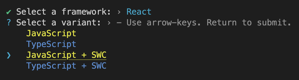 프레임워크로 React를 선택하였고, SWC라는 것이 나오는데, SWC는 아래와 같고, SWC로 선택해 주면 된다.