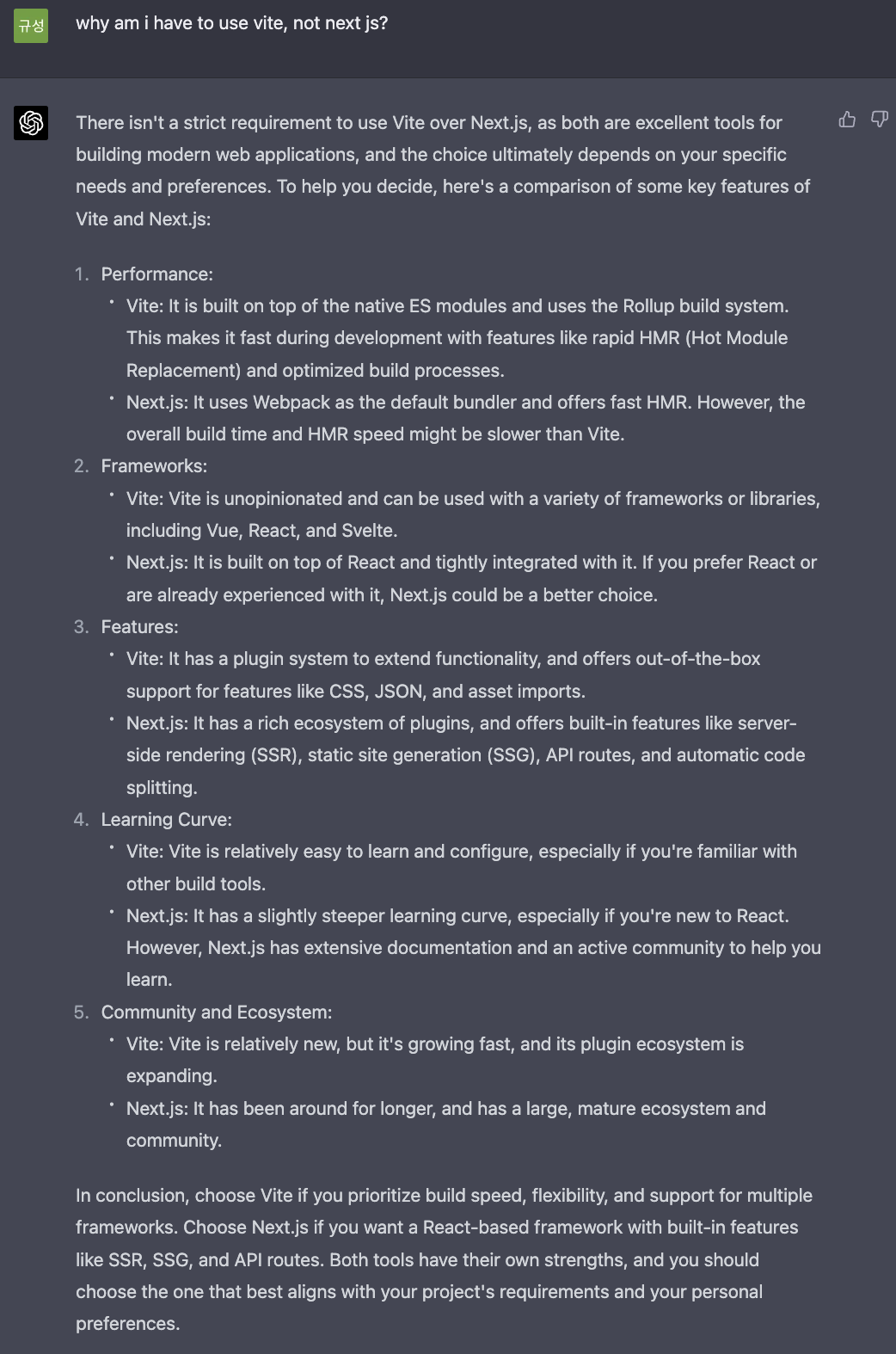 Vite와 Next.js의 장단점에 대해 알려주었다. 가장 큰 차이점으로는 성능이다. Next.js는 Webpack을 기본 번듈러로 사용하여 빠른 HMR을 제공하는 한 편, Vite는 native ES modules을 사용하여 build를 한다. 그래서 개발 환경에서 더 빠른 HMR을 제공하고, build process를 최적화한다. 그리고, Vite는 Vue, React, Svelte 등 다양한 라이브러리 혹은 프레임워크와 함께 사용할 수 있다.