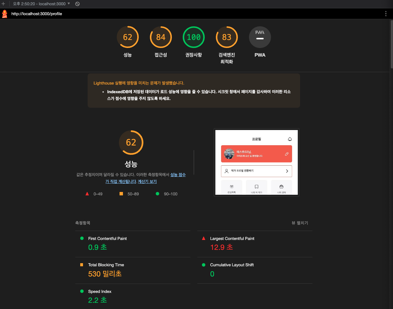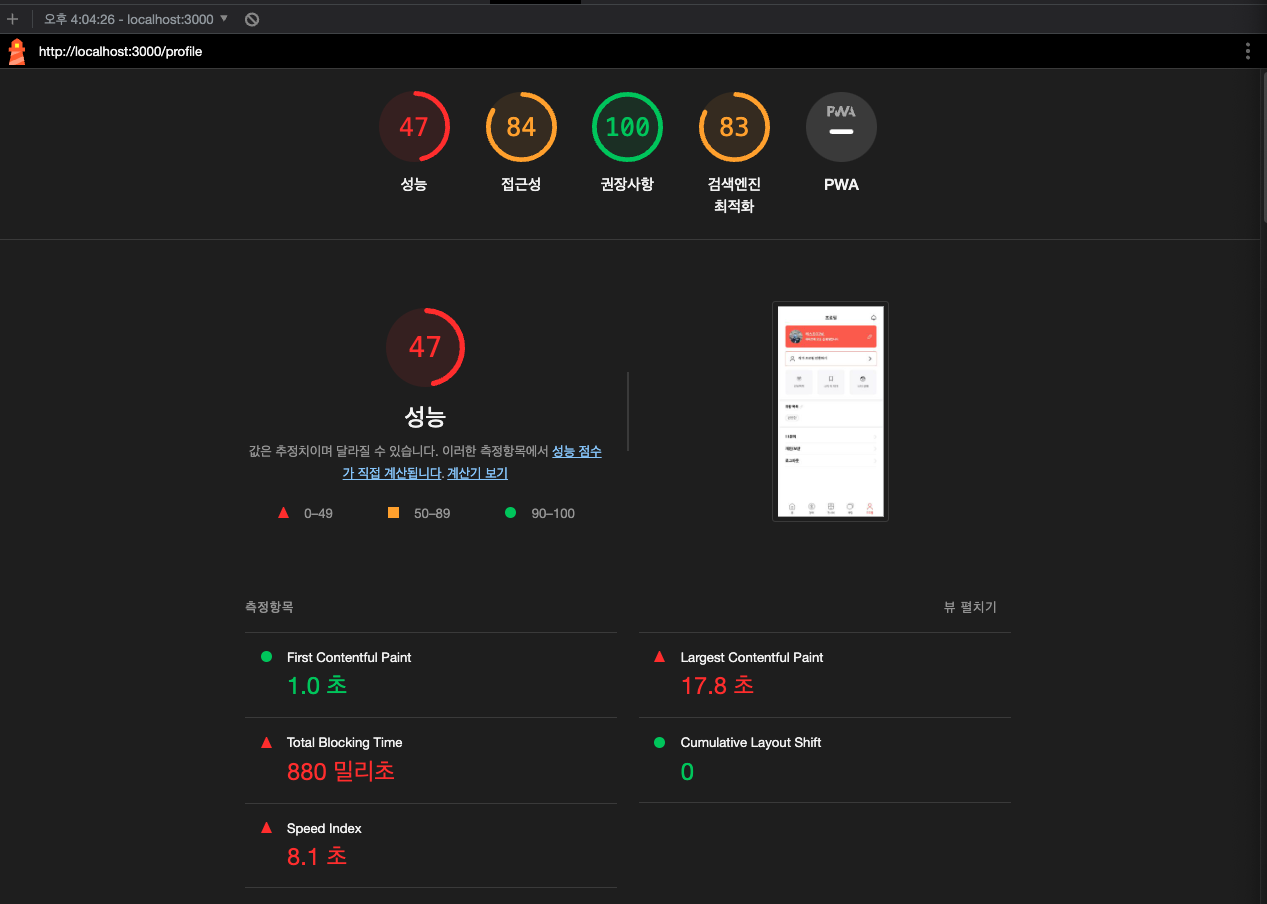 일단, Lighthouse를 개선시키는 것이 목표였기에, home화면보다 기능이 더 적은 프로필 페이지를 개선시키기로 했다.