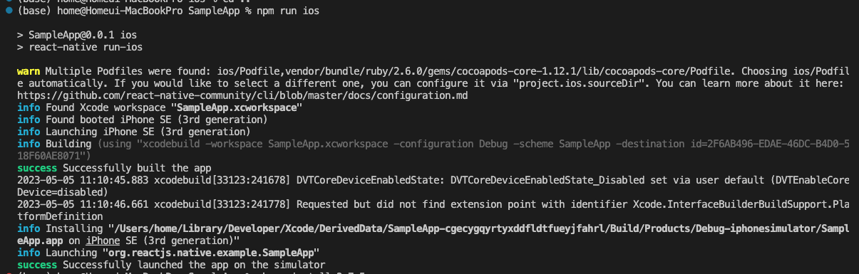 위의 명령어 순서대로 터미널에 입력하니 설치하는데 시간이 조금 걸렸다. 다시 $npm run ios를 입력하니 성공적으로 실행이 되었다.