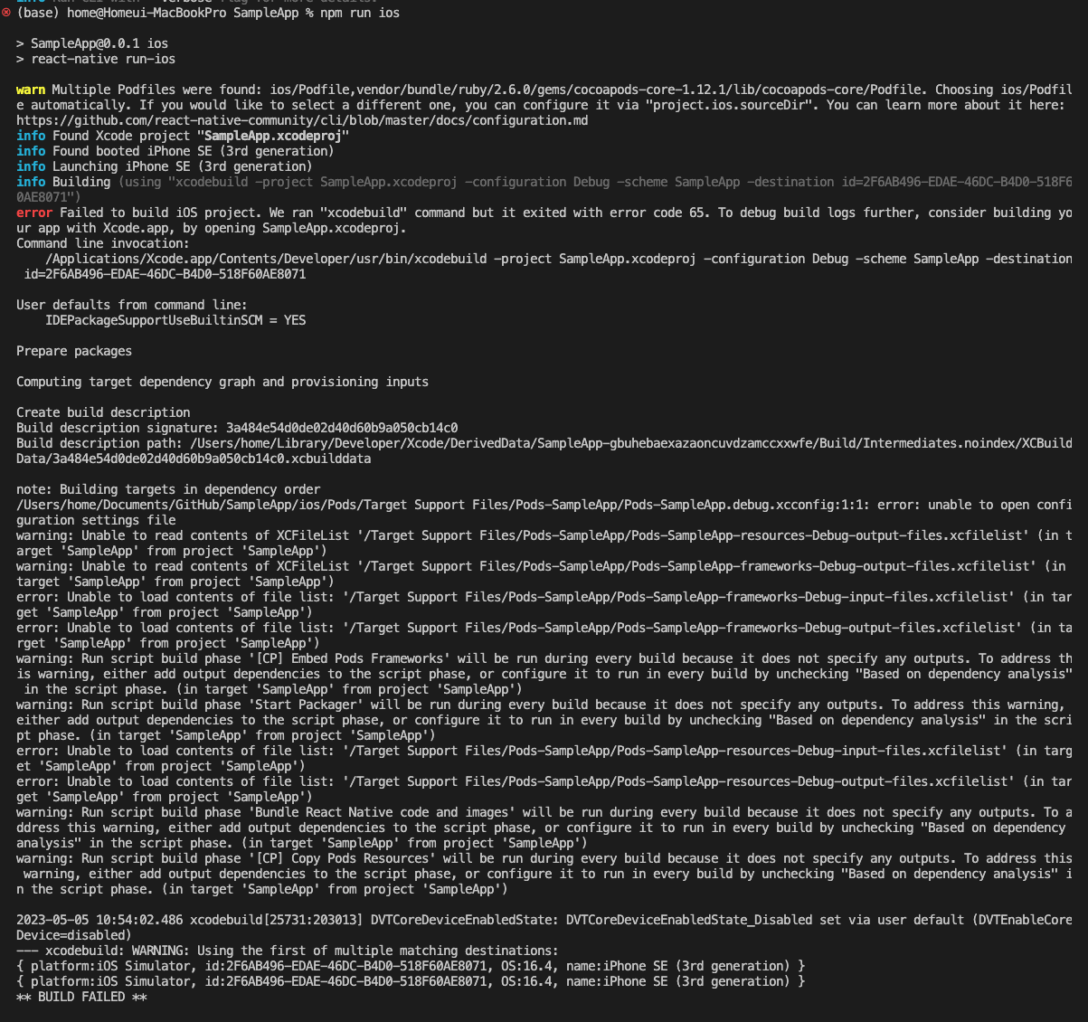 Mac환경에서 React Native를 실행하게 위해 $npm run ios를 치자 아래와 같은 오류가 발생하였다.