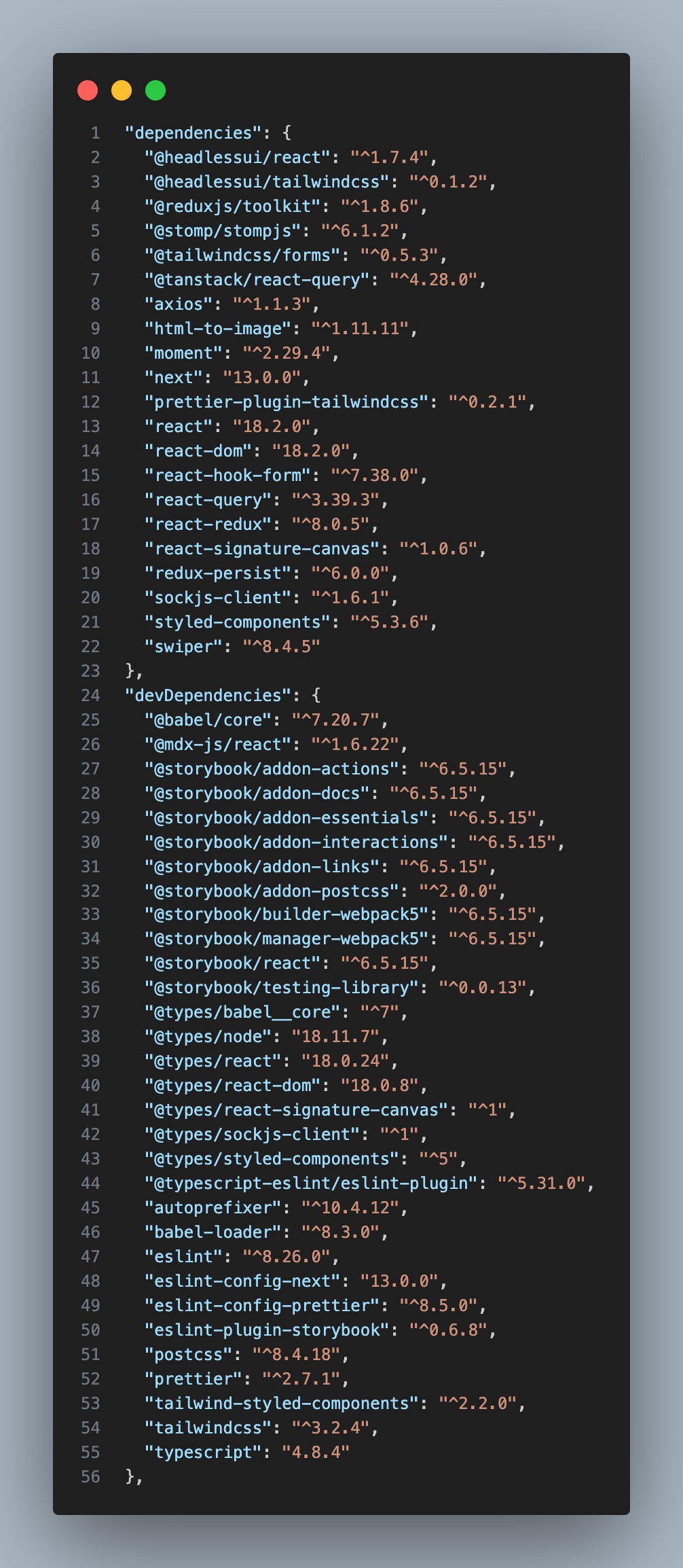 dependencies : tailwindcss, RTK, StompJS, react-query, axios, html-toimage, moment, react-query ..