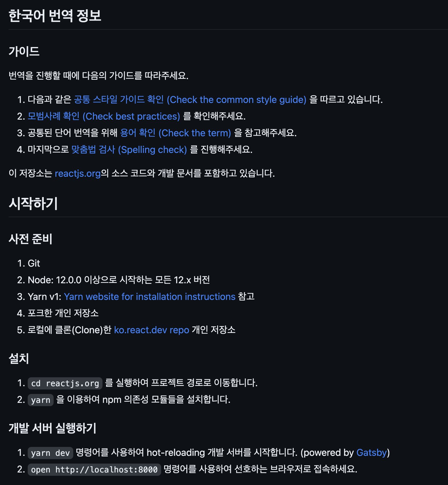 이 중에 ko.react.dev 저장소에 접속하면 다음과 같이 친절하게 가이드라인이 주어진다.