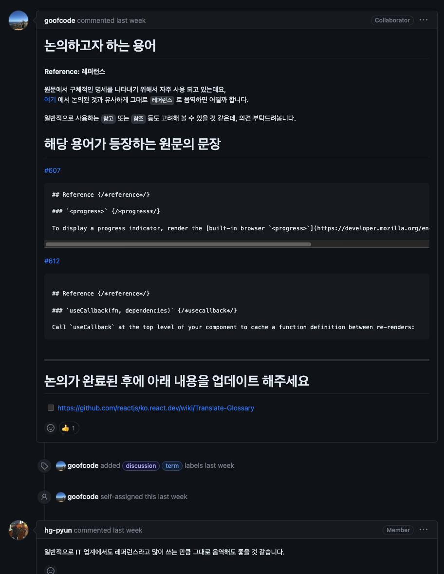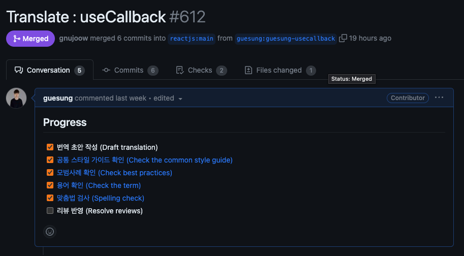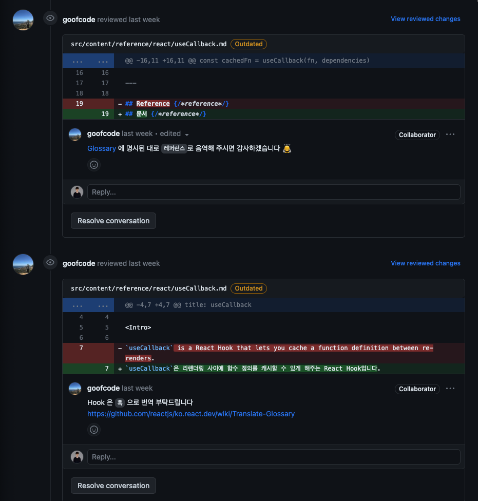 물론 번역을 완벽하게 하여 올리면 좋겠지만, 번역을 처음 해봐서 막막하다면 너무 걱정하지 않아도 된다. 관리자님들이 친절하게 review를 해주실 것이다. 나의 경우 PR올리고 이틀 뒤에 comment를 달아주셨다.