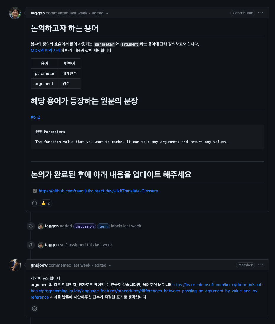 불과 얼마 전에는 React 공식 문서를 열심히 찾아보며 새로운 내용을 학습했던 것이 엊그제 같은데, 지금은 그 문서를 번역하여 다른 이들에게 도움을 주고 있다. '그 사이트, 내가 번역했어!'라고 말할 수 있다는 사실에 너무나도 뿌듯하고, 설렘으로 가득 찬다. 마치 어느 다리를 건너가며 '이 다리 내가 지었어!'라고 자랑스럽게 말하는 어르신들의 마음이 이런 것이었을까.