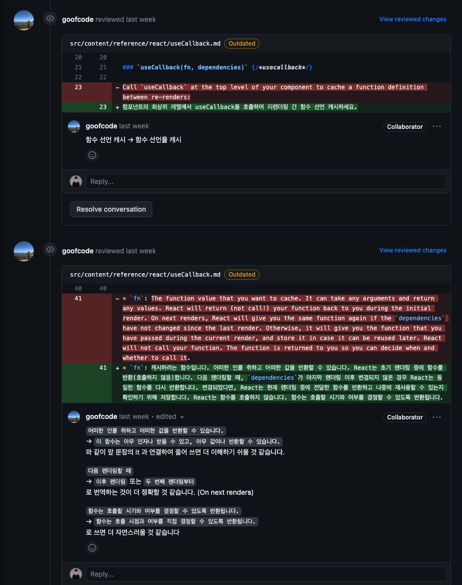 번역 작업을 진행하면서, useCallback에 대한 부분을 추가로 찾아보며, 내가 번역한 내용이 정확한지 확인하는 과정에서 깊이 있게 학습할 수 있었따.