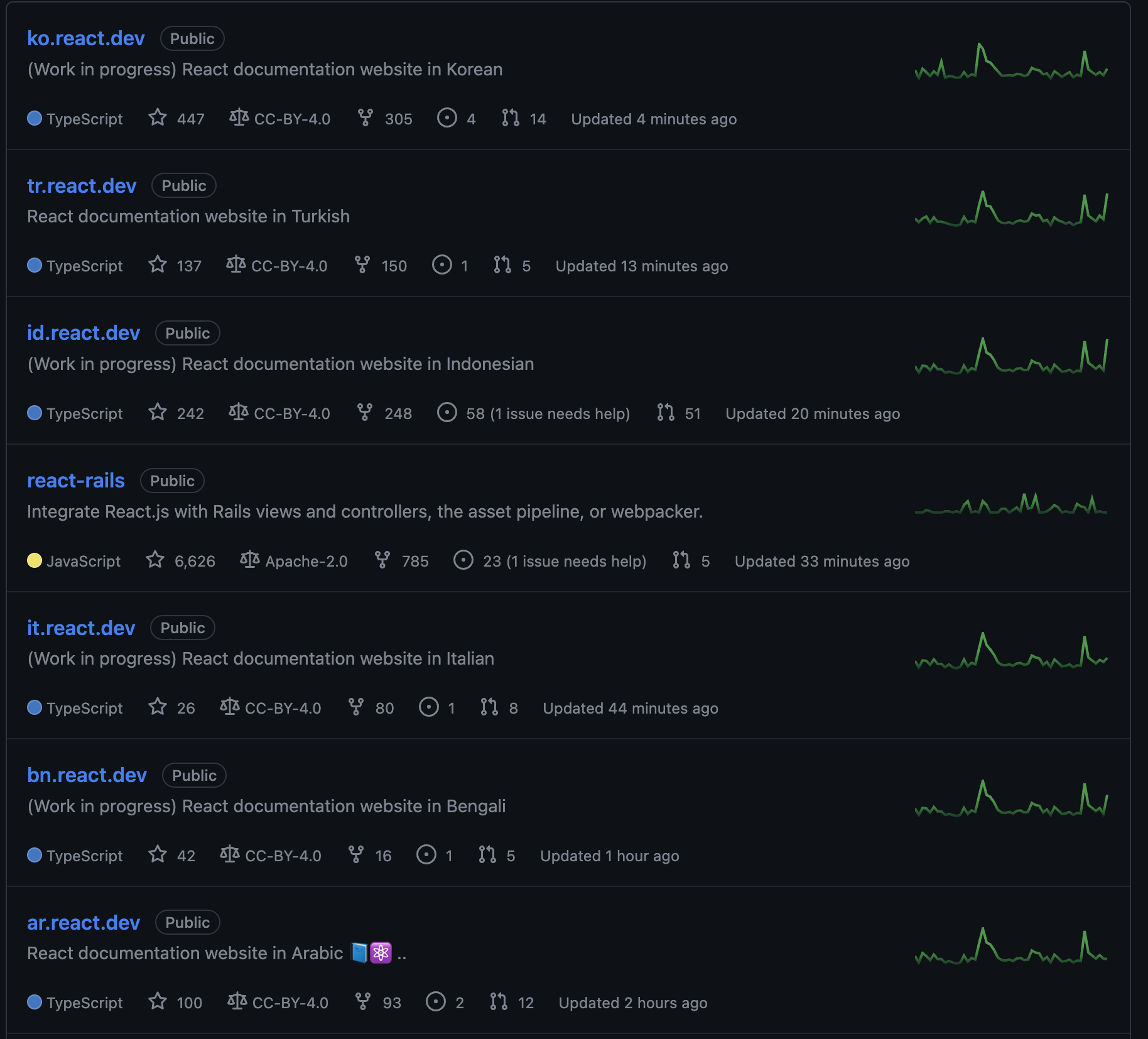 React 공식 github에 접속하면 각 언어별로 저장소가 분리되어있음을 확인할 수 있다.