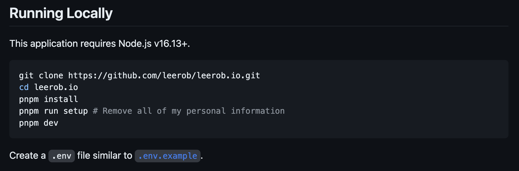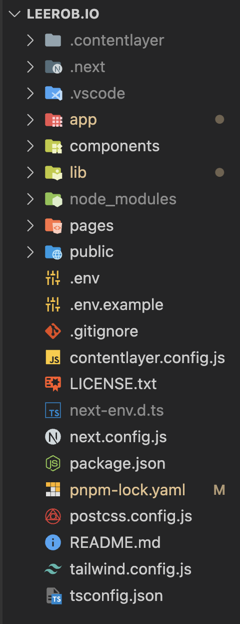 이 프로젝트는 특이하게 pnpm을 사용하고 있다. leerob.io는 Vercel의 부회장인 Leerob가 만든 프로젝트여서, Vercel가 스폰서인 pnpm을 사용하지 않았나 하는 추측을 한다. 만약 pnpm을 처음 사용한다면 링크처럼 설치하면 된다. 나의 경우 mac이어서 $brew install pnpm을 하였다.