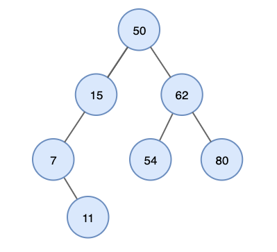 ex) {50,15,62,80,7,54,11}를 이진 탐색트리로 표현한 트리