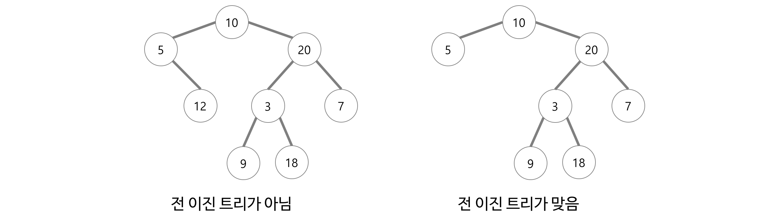 - 마지막 레벨은 꽉 차 있지 않아도 되지만, 노드가 왼쪽에서 오른쪽으로 채워져야 함